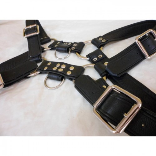 This is the version of our basic bulldog harness, but with an extra strap. The upper end connects to..